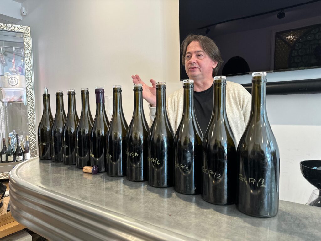 Ein weiterer Aspekt hat uns besonders beeindruckt. Aymé Vadim ist inzwischen bei seiner 11. Lese angekommen, hat aber bislang nur den dritten Jahrgang auf den Markt gebracht: den Jahrgang 2017, der jetzt bei Chronos Wine erhältlich ist. Der 2017er wurde erst 2024 abgefüllt, nach etwa sieben Jahren Reifung im Fass auf der Hefe. Sieben Jahre.